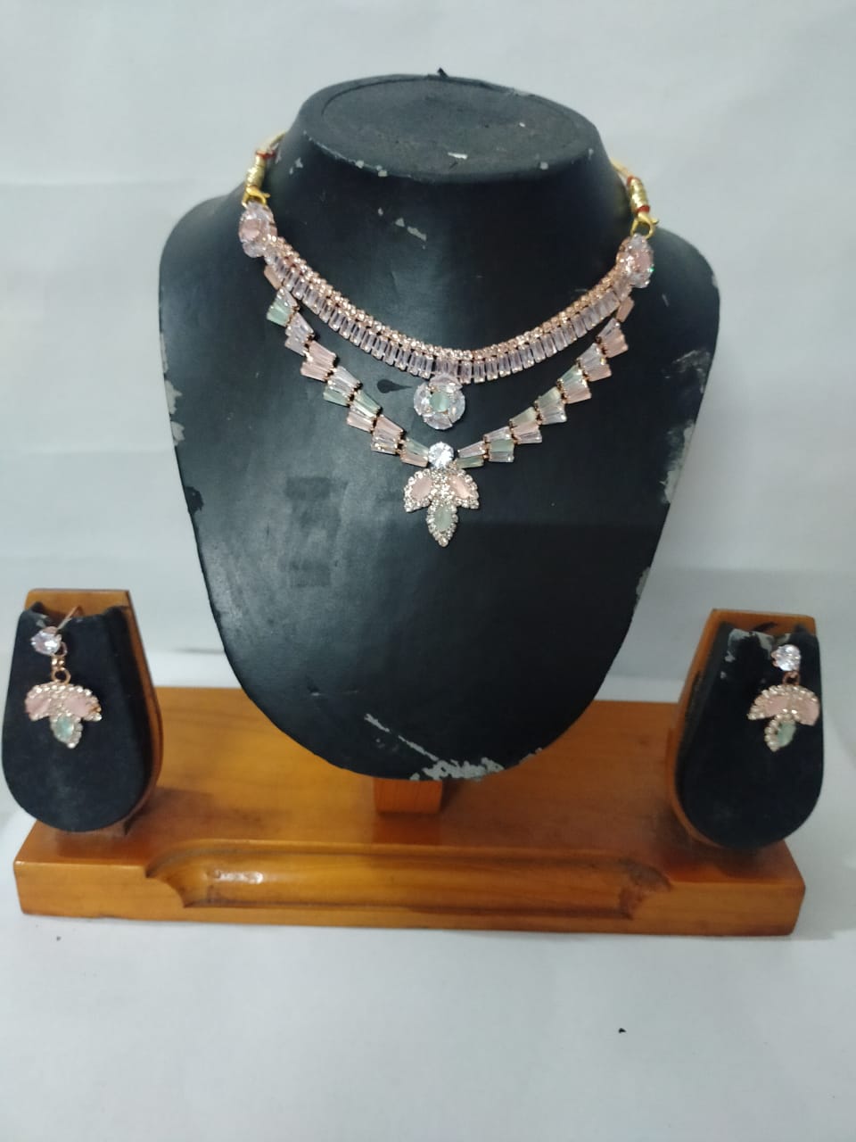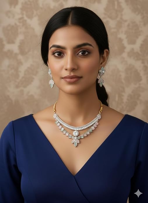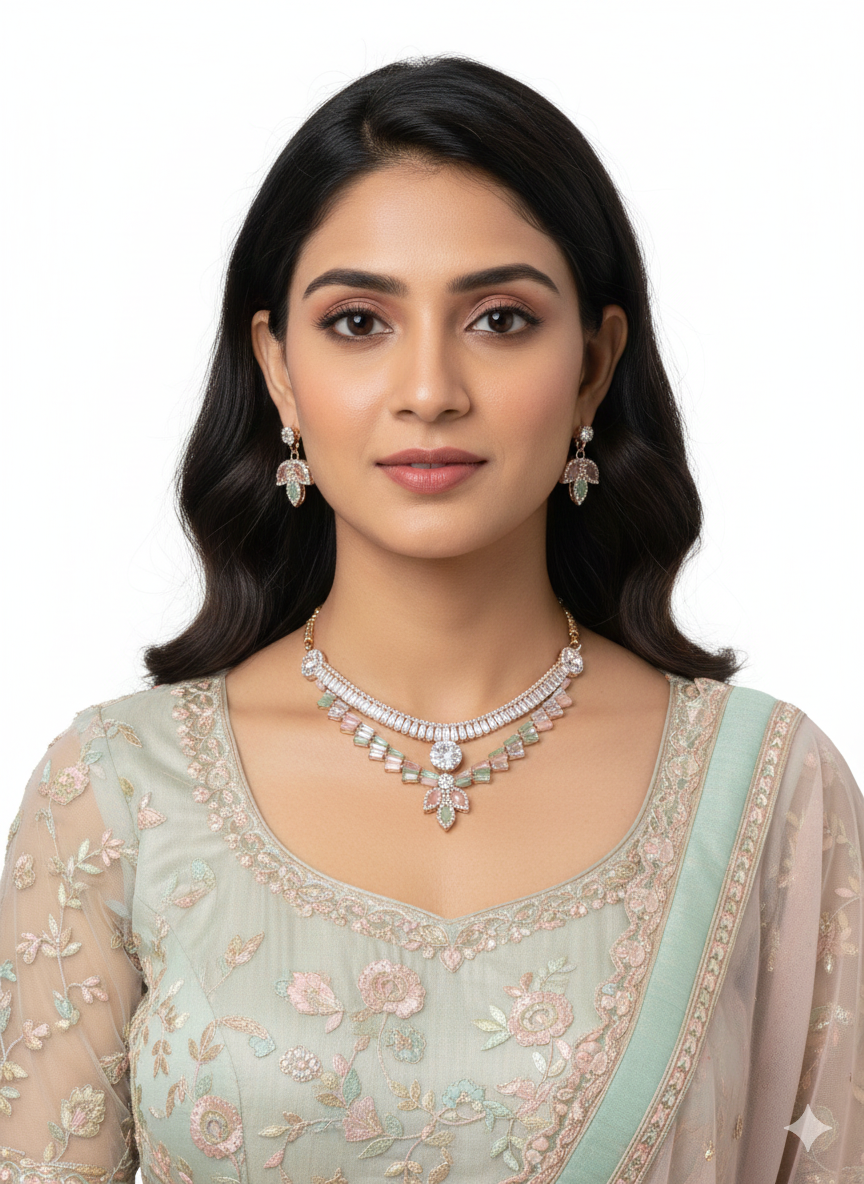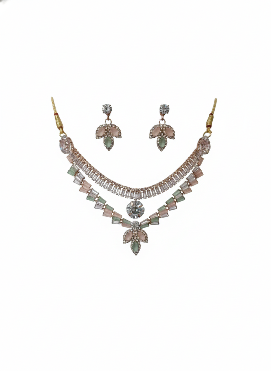 This stunning crystal double-layered necklace set is designed to make a bold statement at any special occasion. Featuring an exquisite combination of multi-coloured stones in soft pink and refreshing green hues, this jewellery set captures attention with its elegant floral design. The necklace showcases two beautifully crafted layers adorned with sparkling crystals and geometric stone arrangements that create a sophisticated look. The centrepiece features a charming floral motif that adds a touch of femininity and grace. Complementing the necklace perfectly, the matching earrings mirror the same floral design with pink and green stones, creating a harmonious and coordinated appearance. The intricate detailing and quality craftsmanship make this set ideal for weddings, festive celebrations, parties, or any event where you want to stand out. The versatile colour palette allows this statement jewellery to pair beautifully with both traditional and contemporary outfits. Whether you’re dressing up for a special celebration or looking for the perfect gift, this crystal necklace and earring set promises to add sparkle and sophistication to any ensemble.