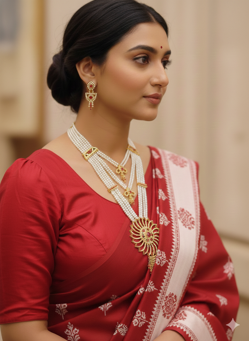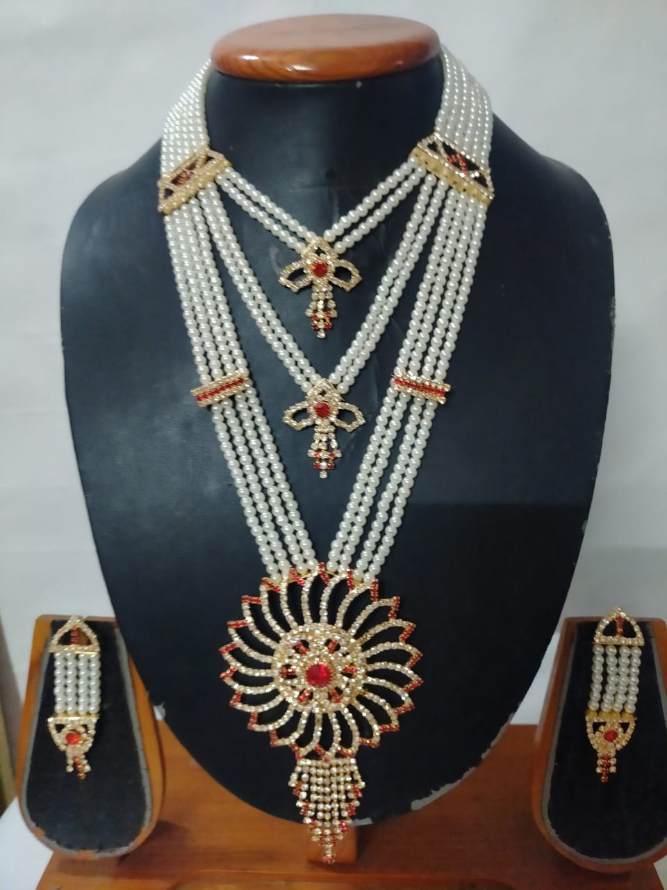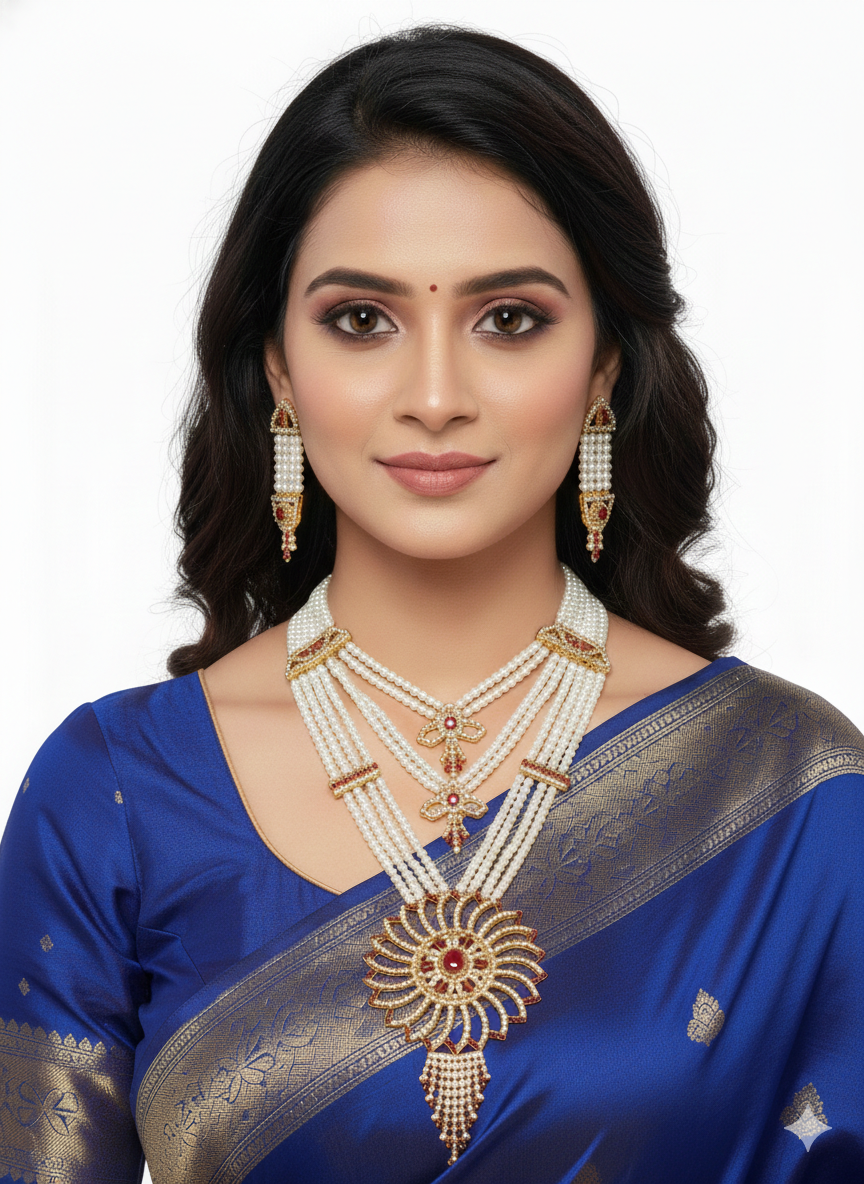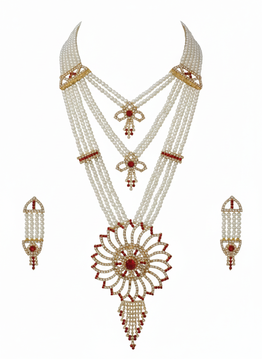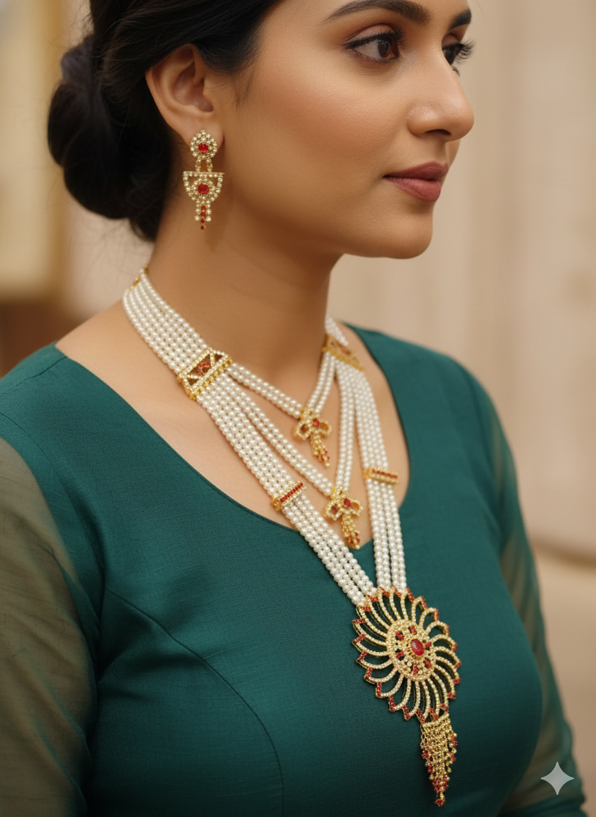 This exquisite multi-layered pearl necklace set is a stunning piece of traditional bridal jewellery that will make you stand out on your special day. The necklace features multiple strands of lustrous pearls arranged in elegant layers, creating a regal and sophisticated look. Adorned with vibrant red stone accents and intricate gold-tone detailing, this set beautifully combines classic elegance with traditional Indian craftsmanship. The centrepiece showcases an ornate sunburst design embellished with red stones and delicate pearl drops, whilst decorative gold-tone elements with red stone accents punctuate the pearl strands at strategic points. The matching earrings complement the necklace perfectly, featuring pearl strands and red stone embellishments in a coordinated design. This jewellery set is ideal for weddings, festive celebrations, and special occasions where you want to make a memorable impression. The timeless combination of pearls, red stones, and gold-tone metalwork creates a look that is both traditional and breathtaking, making it a perfect choice for brides and anyone seeking to add a touch of grandeur to their ensemble.