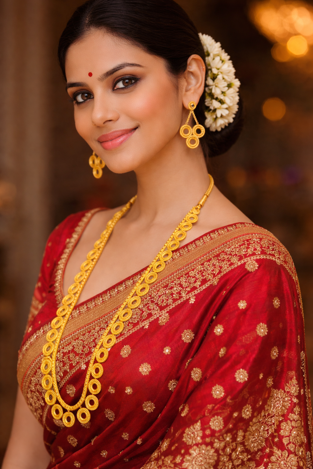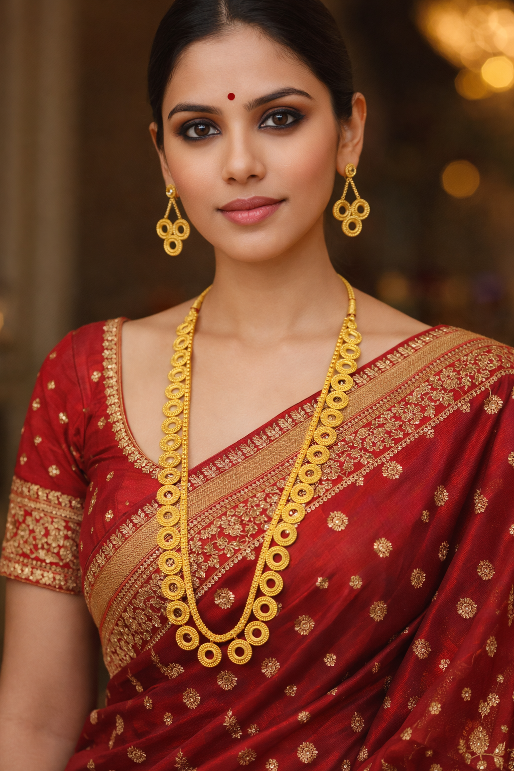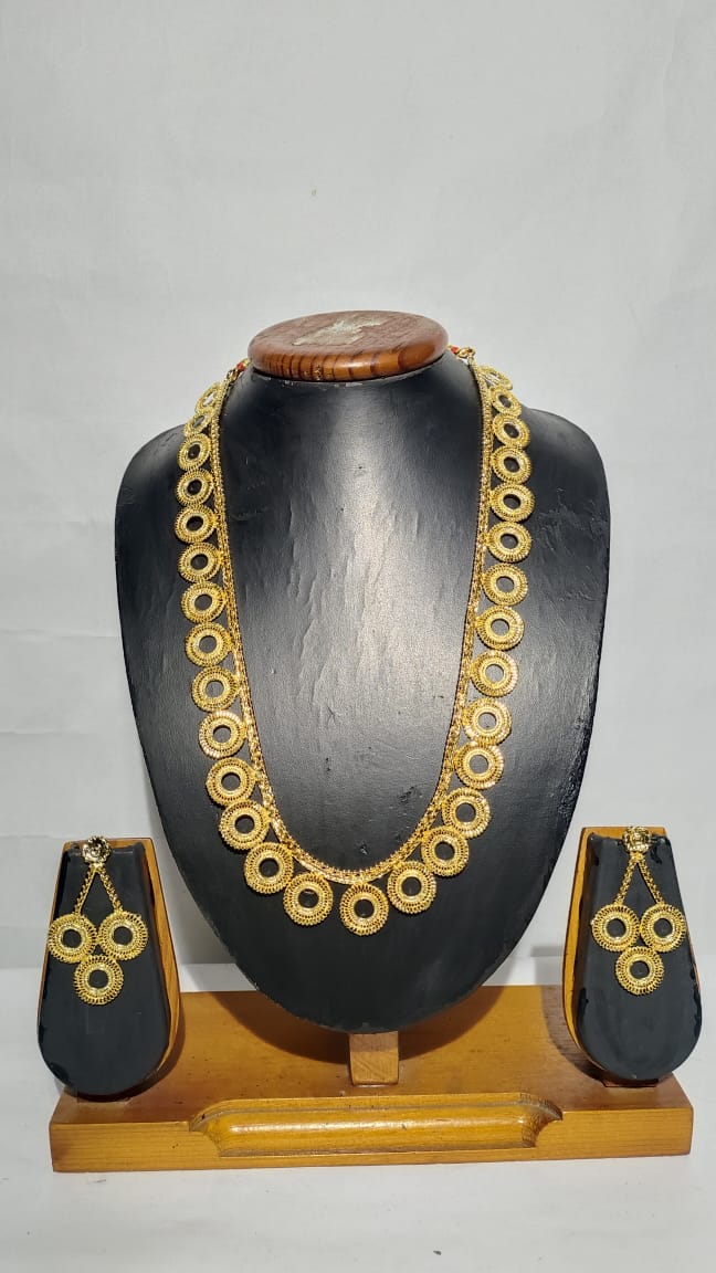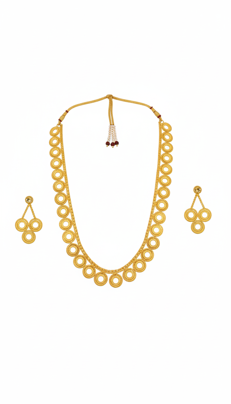 This Traditional Circular Design Gold Plated Necklace Set with Earrings showcases timeless Indian craftsmanship with a refined gold plated finish. Featuring beautifully arranged circular motifs, the set offers a rich and elegant look while remaining lightweight and comfortable. Ideal for weddings, festive celebrations, and cultural occasions, it pairs perfectly with sarees, lehengas, and ethnic outfits.