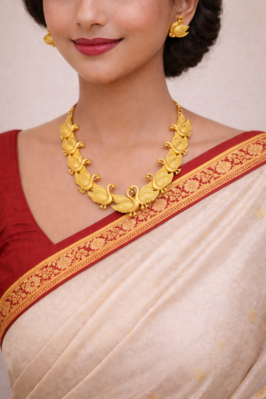 This Traditional Duck Motif Design Gold Plated Necklace Set with Earrings showcases beautifully crafted duck-shaped elements inspired by classic Indian jewellery artistry. Finished with premium gold plating, the set delivers a rich traditional look while remaining lightweight and comfortable. Perfect for weddings, festivals, and cultural celebrations, it pairs gracefully with sarees and ethnic outfits.
