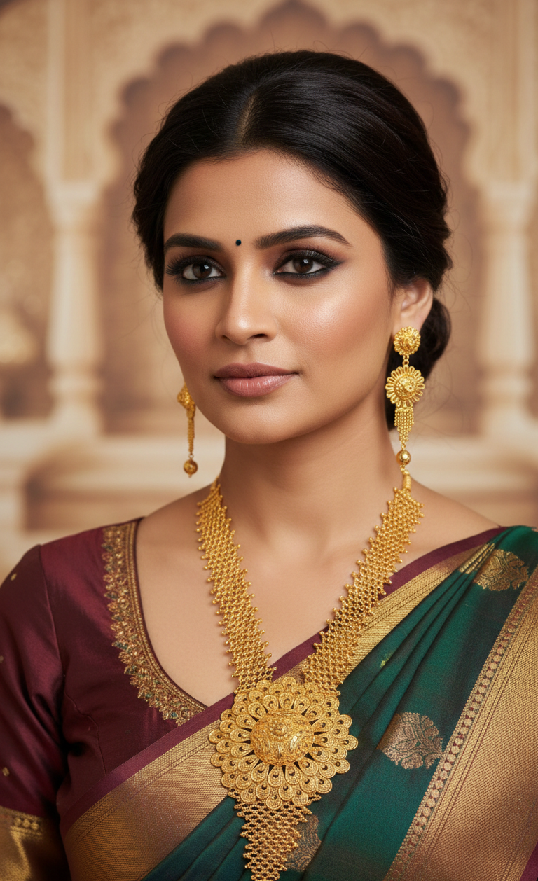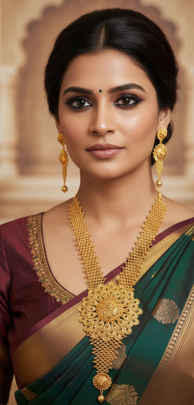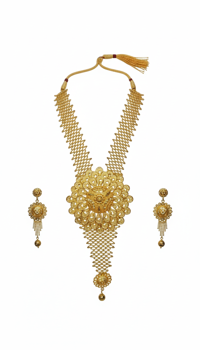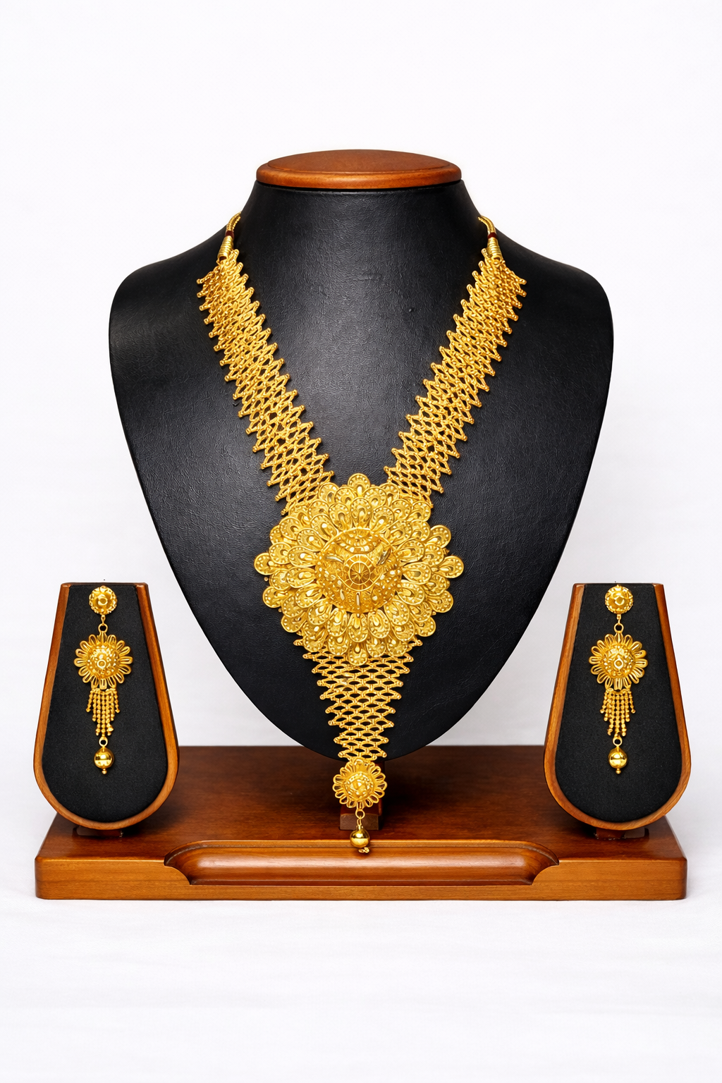 This Traditional Floral Mesh Design Gold Plated Necklace Set with Earrings features an intricately detailed floral centerpiece paired with a graceful mesh-style chain. Finished with premium gold plating, it offers a rich traditional appearance while remaining lightweight and comfortable. Perfect for weddings, festivals, and cultural celebrations, this set complements sarees and ethnic ensembles beautifully.