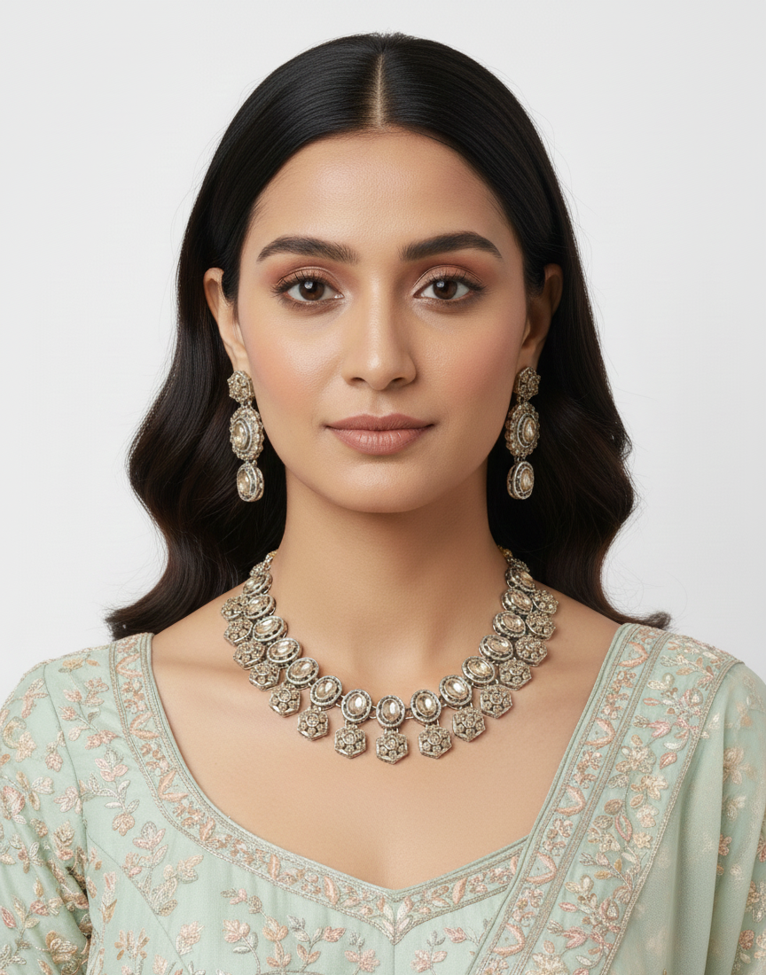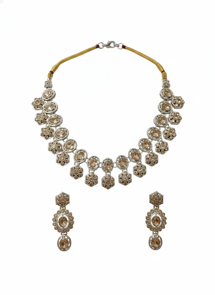 that’s sure to turn heads. The matching chandelier drop earrings perfectly complement the necklace, featuring cascading baguette cut stones that add movement and elegance to your look. The warm rose gold tone flatters all skin tones and adds a romantic touch to any ensemble. Whether you’re attending a wedding, celebrating a festival, or enjoying an evening out, this versatile set elevates your style effortlessly. The secure clasps ensure comfortable wear throughout the day or night. This jewellery set makes an excellent gift for loved ones or a luxurious treat for yourself. Perfect for pairing with both traditional and western outfits, it’s a must-have addition to any jewellery collection.