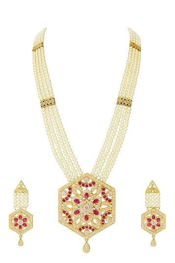 Elegant pearl necklace set with gold-plated crystal pendant, featuring traditional multi-strand pearl beads and matching stone earrings, perfect for weddings, festivals, and special occasions.