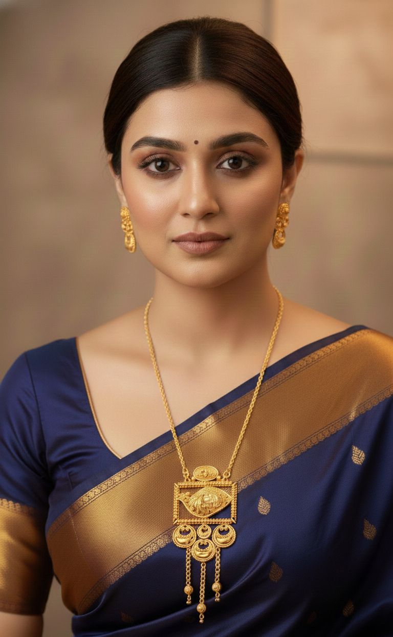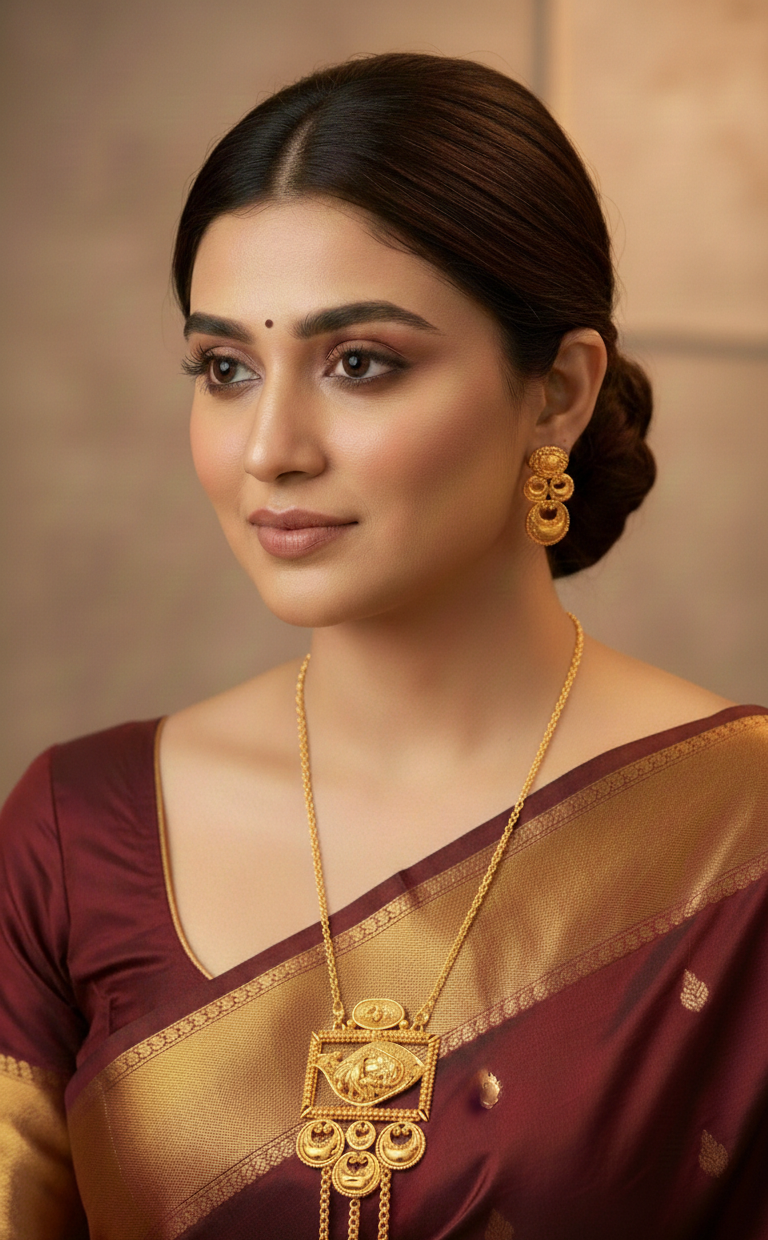 This Traditional Square Pendant Design Gold Plated Necklace Set with Earrings features an intricately crafted square centerpiece with hanging circular elements that add graceful movement. Finished with premium gold plating, the set offers a rich traditional look while remaining lightweight and comfortable. Ideal for weddings, festivals, and ethnic occasions, it complements sarees and traditional outfits beautifully.