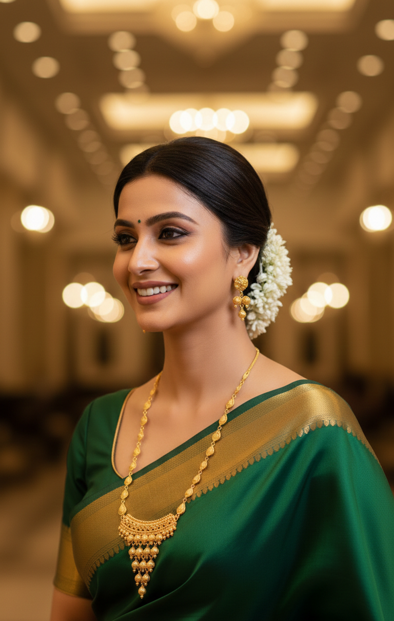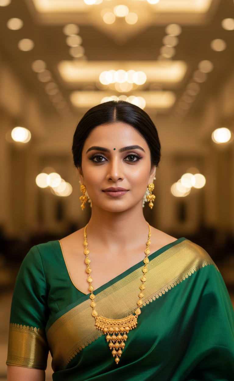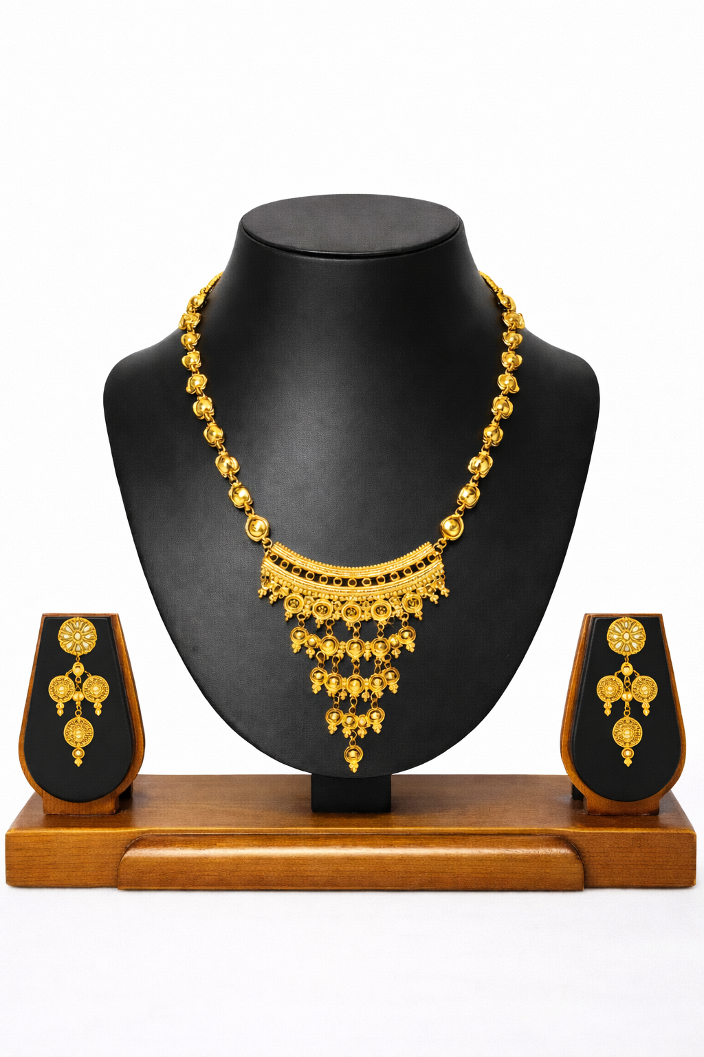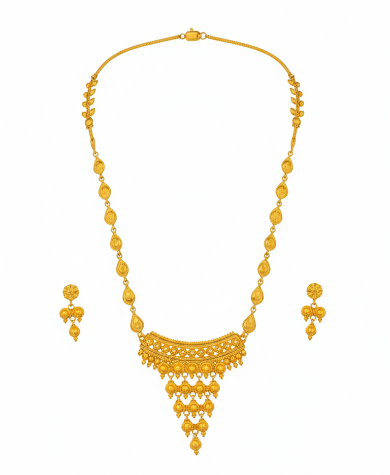 This Traditional Teardrop Link Pendant Design Gold Plated Necklace Set with Earrings features gracefully connected teardrop-shaped links leading to a beautifully detailed half-moon style pendant with delicate hanging elements. Finished with premium 1.5 gram gold plating, the set offers a rich traditional appeal while remaining lightweight and comfortable for weddings, festivals, and cultural occasions.